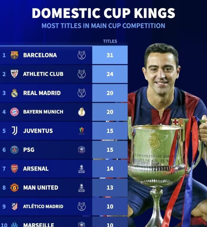 权威数据网站德转近期发布了五大联赛国内杯赛冠军次数的排行榜,引起了广泛关注。西甲豪门巴塞罗那以31次国王杯冠军稳居榜首,展现了他们在该项赛事中的绝对统治力。紧随其后的是毕尔巴鄂竞技和皇家马德里,分别以24次和20次冠军位列第二和第三。德甲霸主拜仁慕尼黑和意甲劲旅尤文图斯也分别以20次和15次冠军跻身榜单前五。